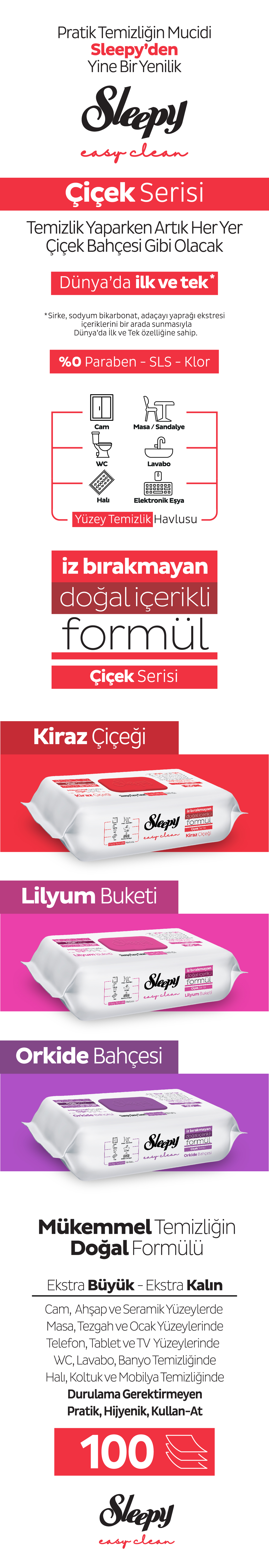 Orkide Bahçesi, Lilyum Buketi ve Kiraz Çiçeği kokularıyla zenginleştirilmiş Sleepy Easy Clean Çiçek Serisi, temizlikte ferahlığı ve hijyeni bir arada sunar.
